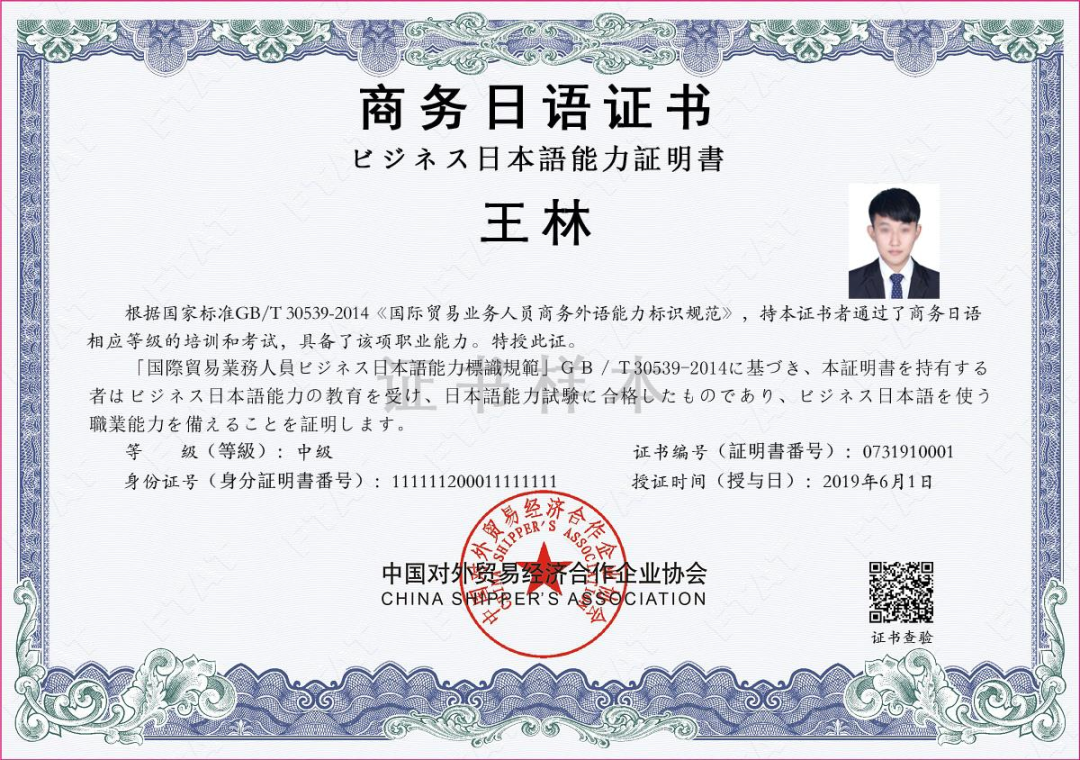“商务英语证书(中级)”/“商务日语证书(中级)”。证书由中国对外贸易经济合作企业协会颁发,申领费用自理。证书全国通用,长期有效。